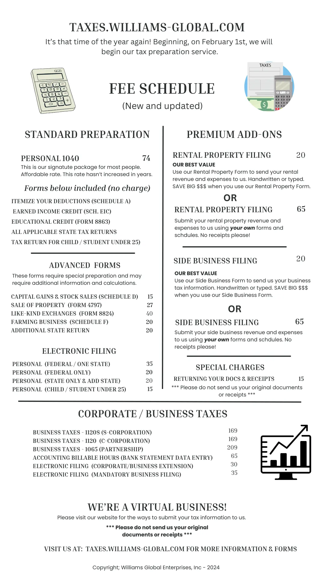 Williams Global Tax Service has been in business for over 25 years. Most of what we do is by snail mail, email or text. We don’t keep traditional office hours, because it saves us time and allows us to keep our cost down and our fees low. If you need assistance please let us know.